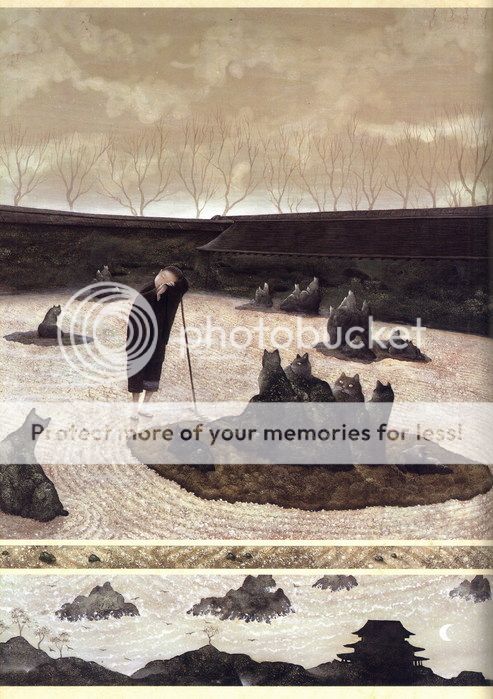 擅畫貓的小和尚某日借宿在一間荒敗的寺院,然後手賤又在廟裡的白屏風上塗貓咪,當他畫睏了想找地方睡覺,突然想起自己的師父曾告誡過:「晚上別待在大地方,要待在小地方。」雖不解其意,但小和尚還是離開大殿,睡進一個有拉門的小櫥櫃。